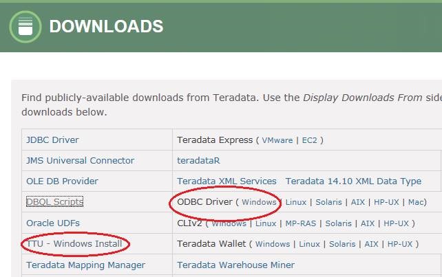 1. You need to download the Teradata ODBC driver here (you’ll need to register for an account). I’d suggest you download the Teradata Tools and Utilities (or TTU for short) so you can test things if you run into issues, but you can just download the ODBC driver and plow ahead if you’re a gambling man. You’ll need the 64-bit version of the driver.